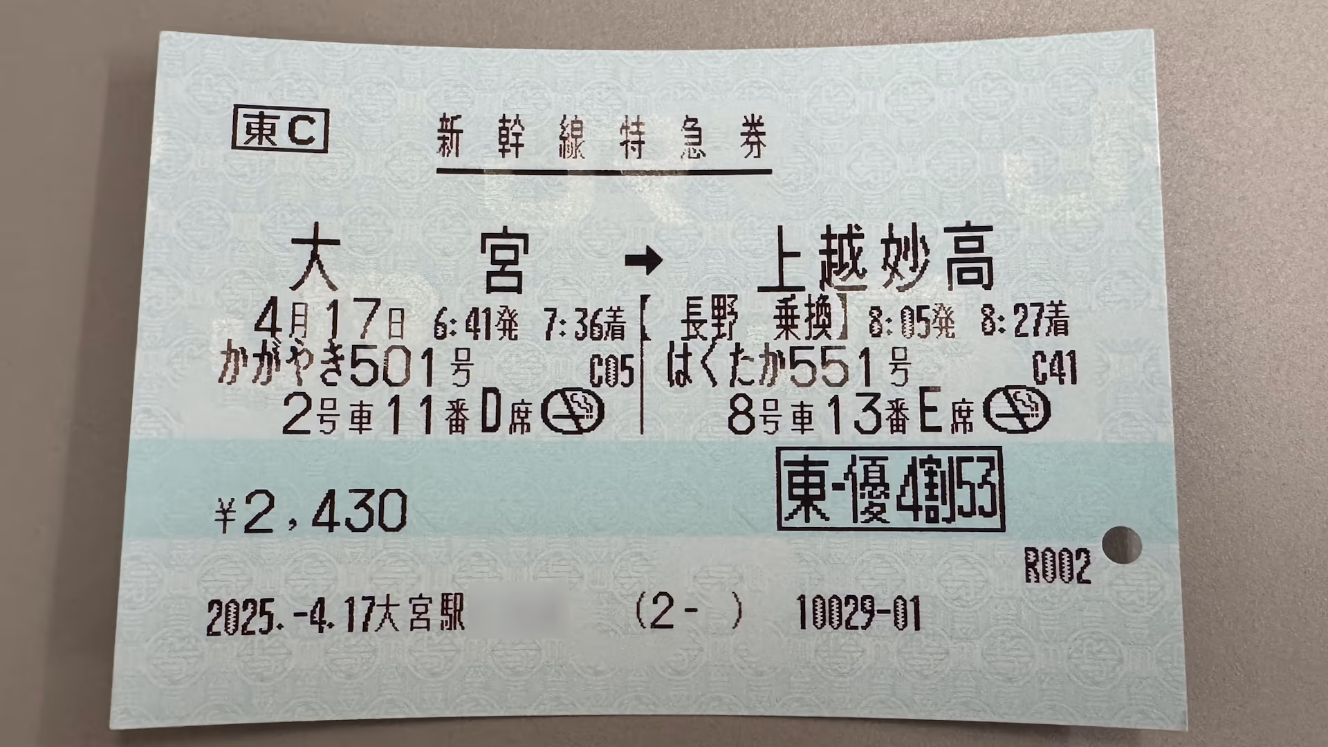 そういえば新幹線の同一方向へは改札を出なければ同じ金額で乗り継げること(いわゆるラッチ内乗り継ぎ)を思い出し、ここ最近やたらと暑い関東で待つよりも涼しそうな長野で待った方が快適と考え、窓口に行って乗車変更してもらいに行きました。JREバンクの優待を使っているので一抹の不安がありますが、ダメならダメで予定通りの列車に乗れば良いだけです。