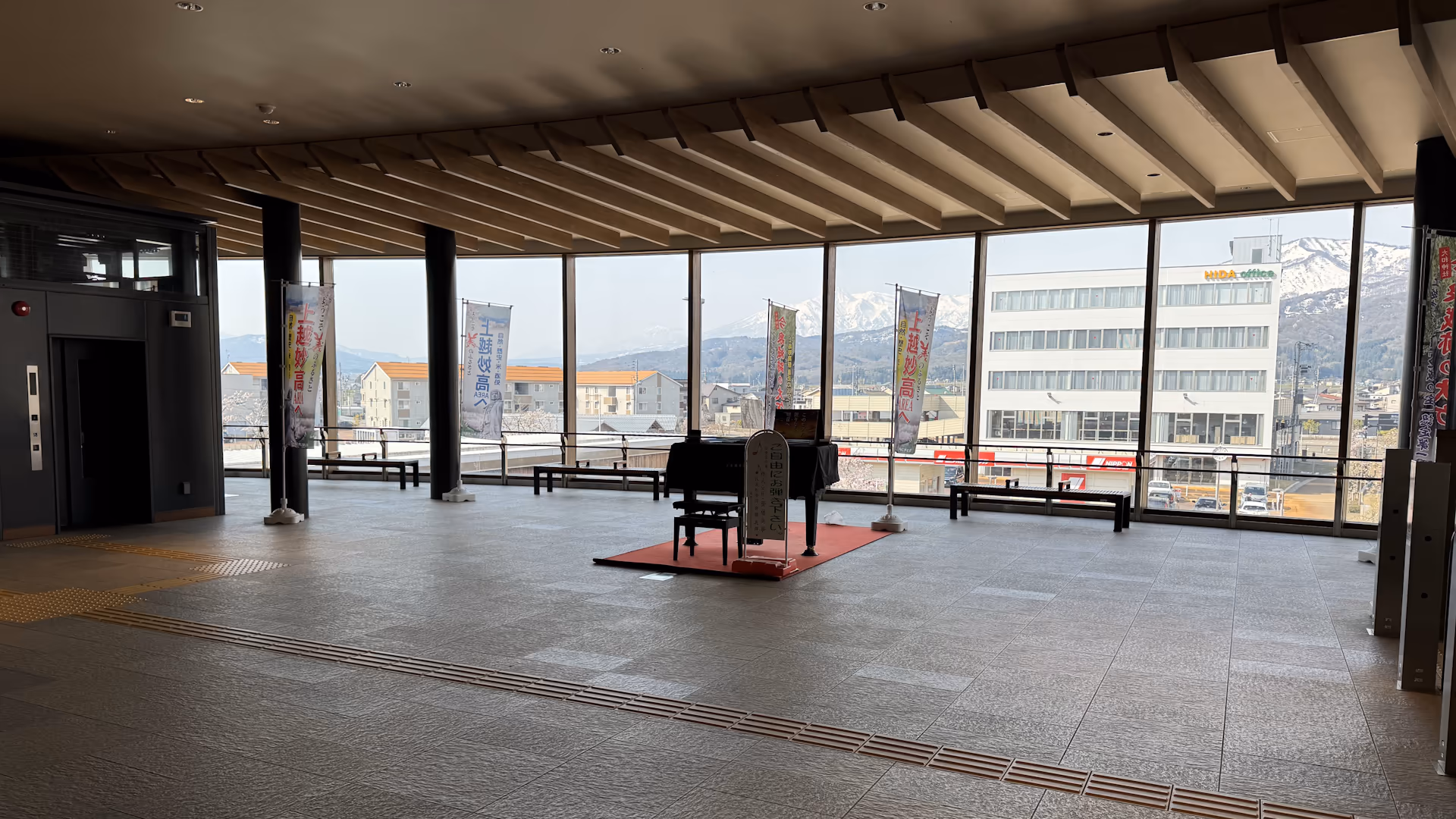 JR東日本と西日本の境界駅で、ホーム・コンコース・駅前広場すべてが広い印象の駅。ぽつんと駅ピアノもありました。