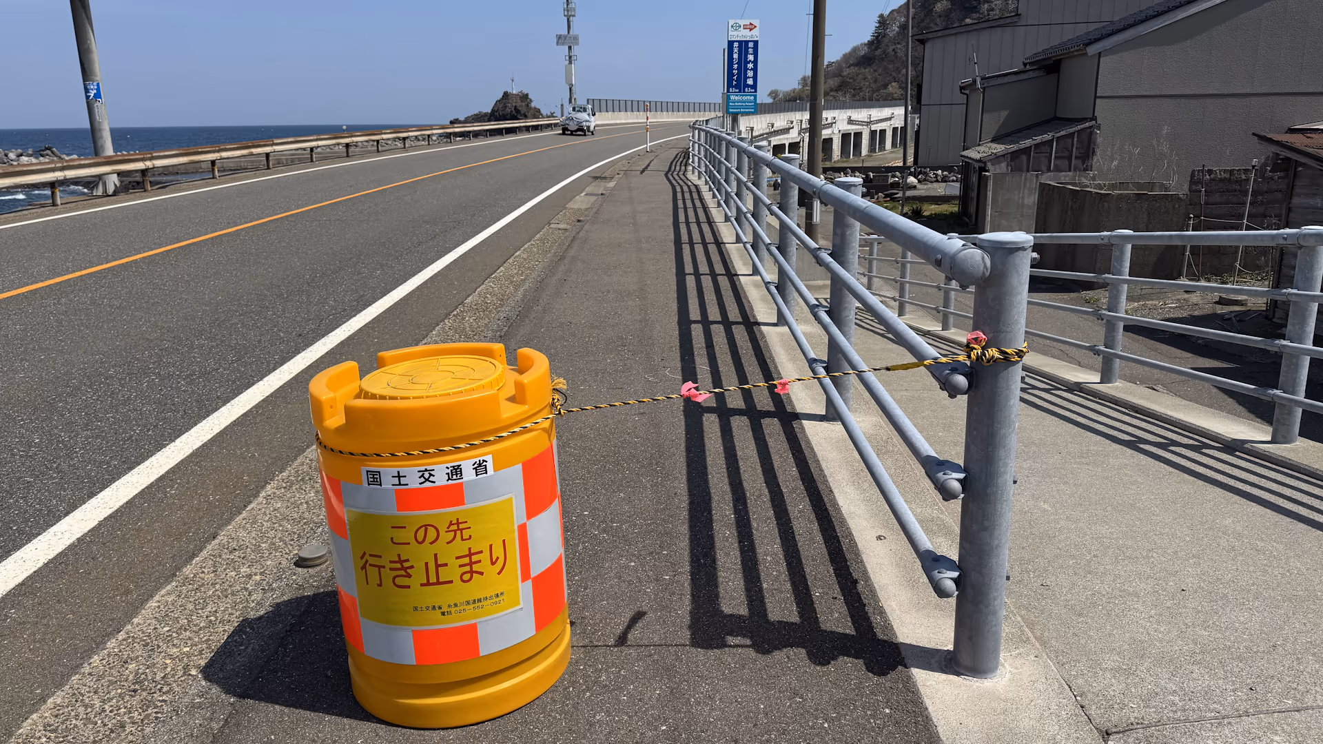 雁木という民家から張り出た軒が特徴で、豪雪地帯の歩道の通行を確保するために建てられているそうです。張り出た軒はちゃんと民家と一体化した屋根の一部となっており、どう見ても人様の土地なので、非常に入り辛いですね。筆者はほとんどの区間を軒の外、白線の内側を通行していました。冬は言わずもがな、夏は日除けにちょうどいいかもしれませんが。