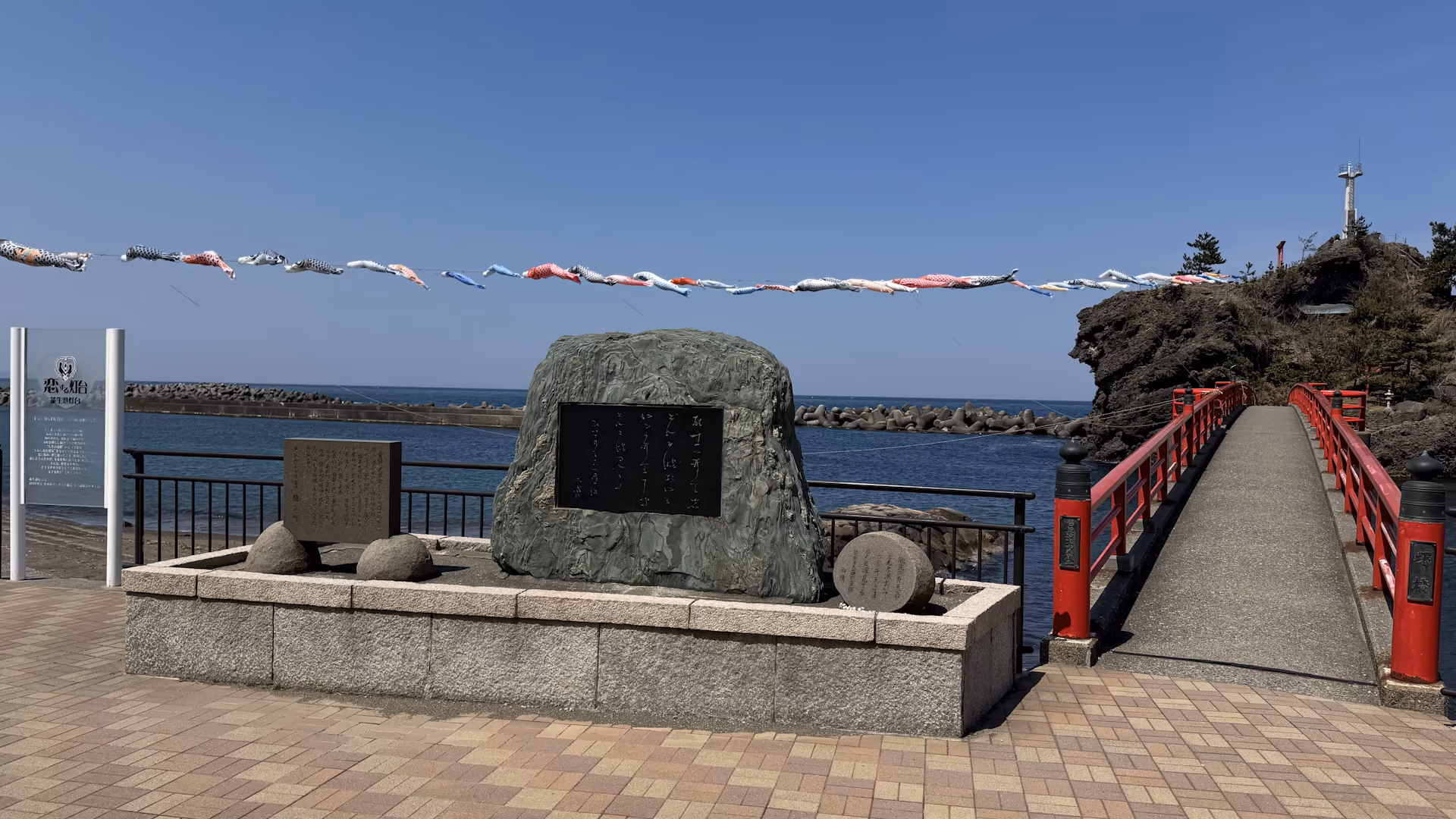 筒石と能生のどちらで降りるか考えましたが、今回は能生で下車。20分ほど北東に歩いたところにある弁天岩を目指します。