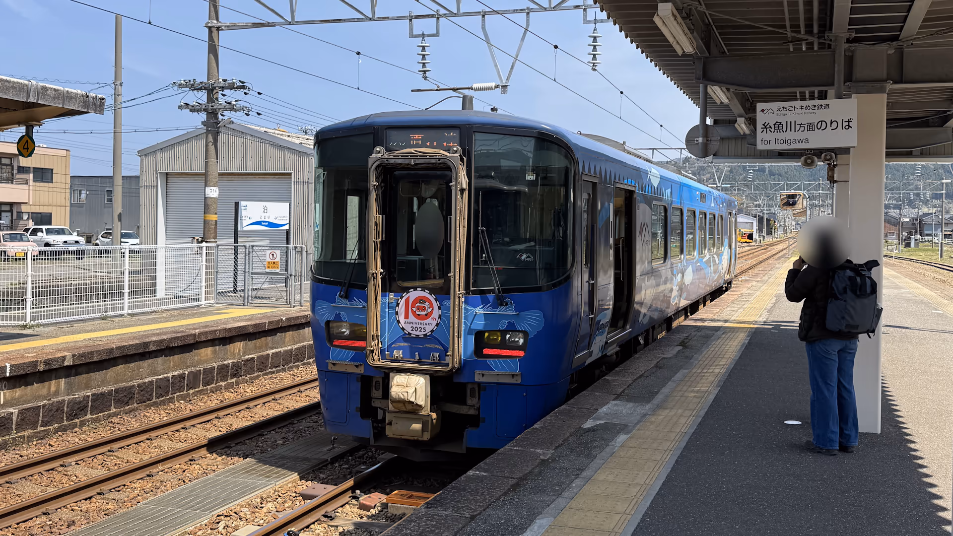 日本海ひすいラインは本数が少なく、先ほど上越妙高から高田まで乗った1本前の列車でも、同じ列車への接続となります。ただし、乗り換え時間は4分なので、筆者のようにきっぷを買い直す人は乗り遅れるリスクがあります。高田駅で長時間停車するため、遅れのリスクについては少なさそうです。