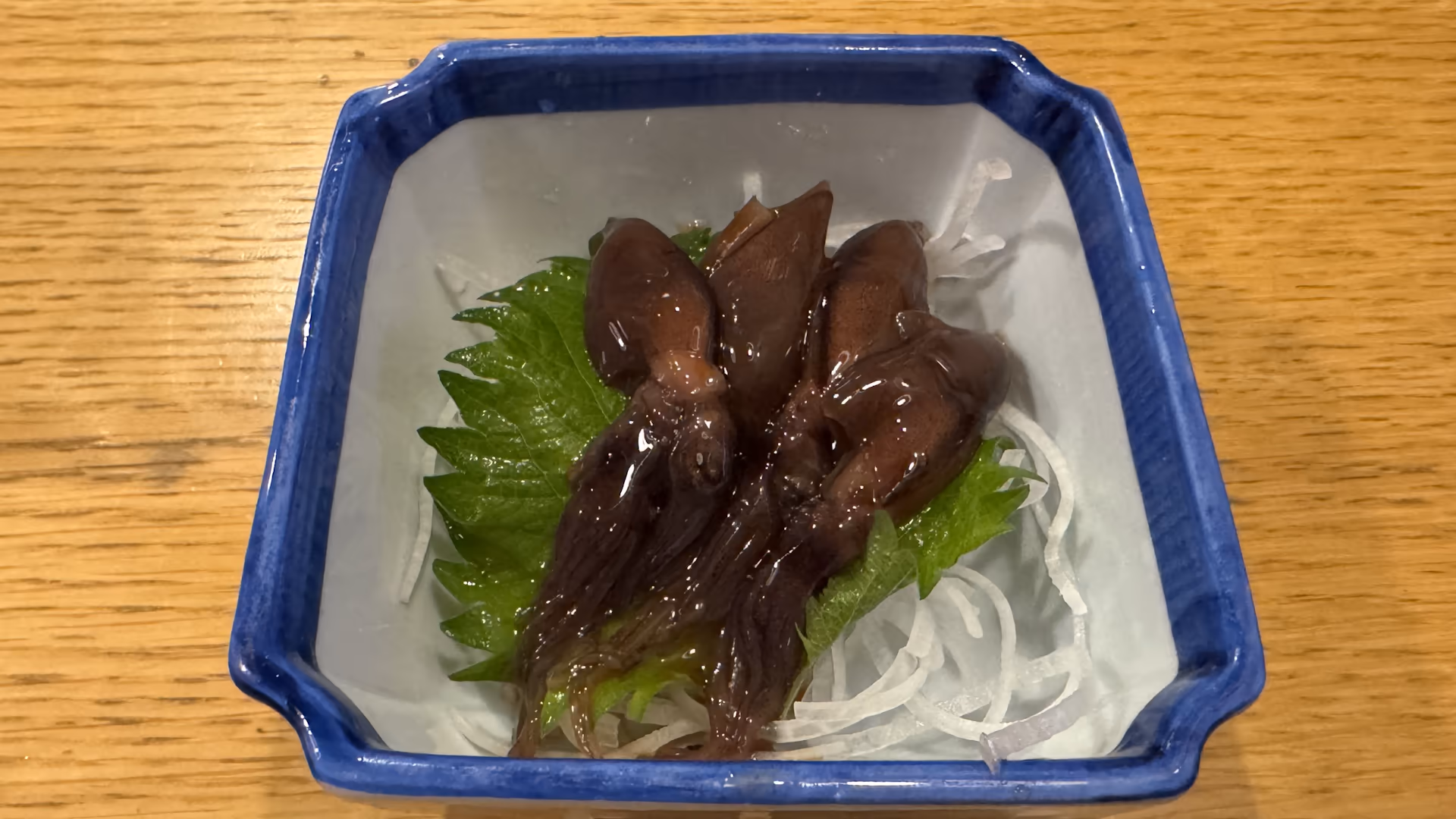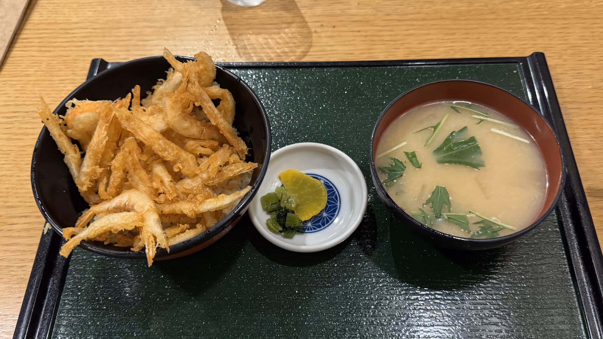 駅ナカの白エビ天丼と単品メニューからホタルイカ。どちらも見た目以上に美味い。