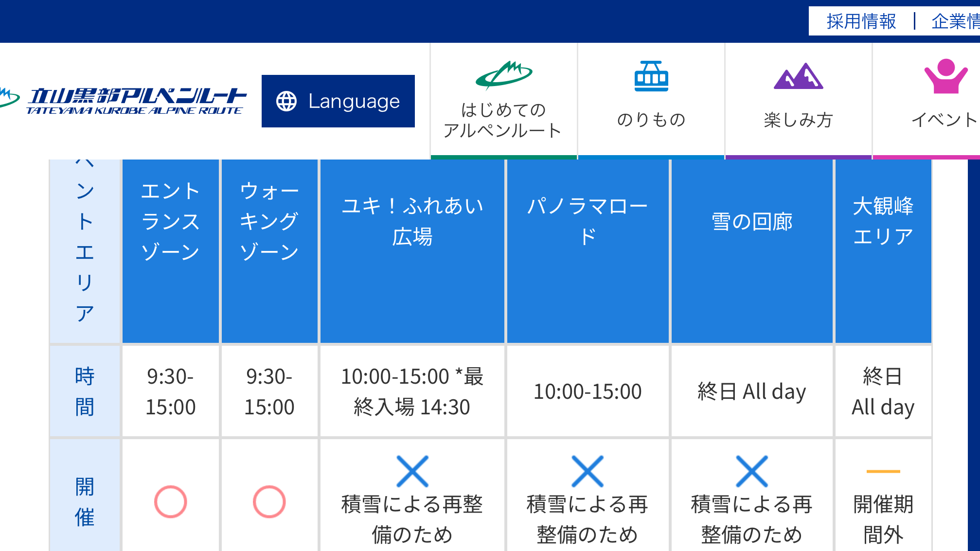 公式サイトを確認したところ、バツ印がたくさんついていました。パノラマロードは通行不可となっていますが、ウォーキングゾーンは開放されるようなので、雪の大谷へは歩いて見に行くことができるようです。