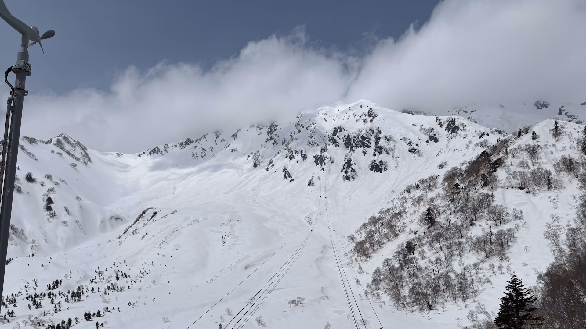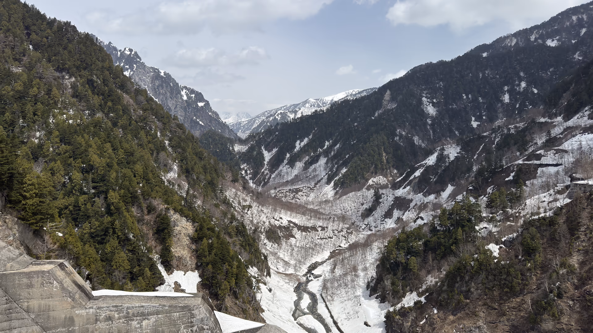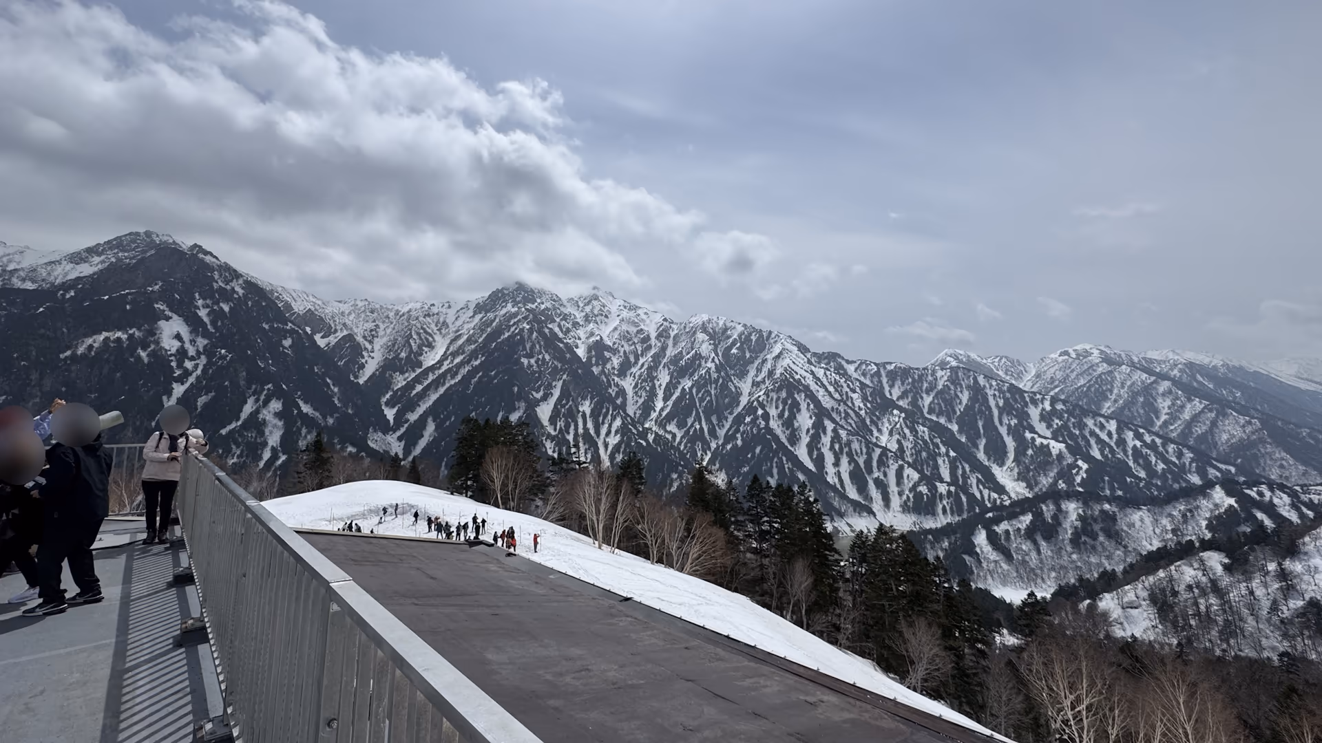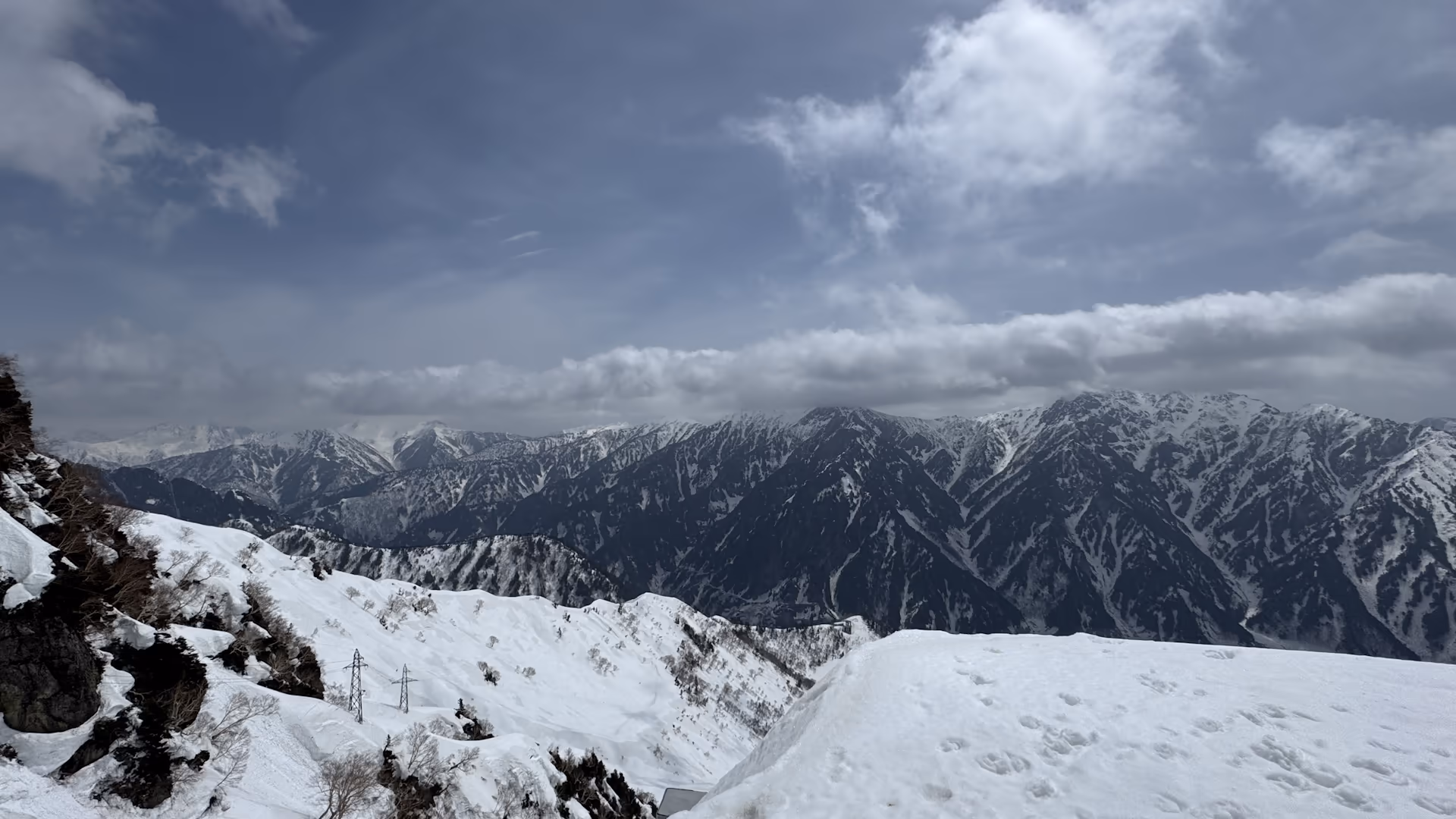 長野側の山々がそびえます。長野側は雪が薄いですね。立山側は近すぎて何も見えません。