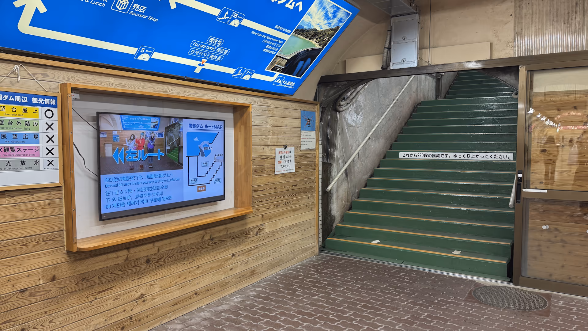黒部ダムの展望台は220段の階段を上る必要があります(ケーブルカーへ直行する人は上る必要なし)。ちなみに220段上った先にあるレストハウスは暖房ガンガンでしたw
